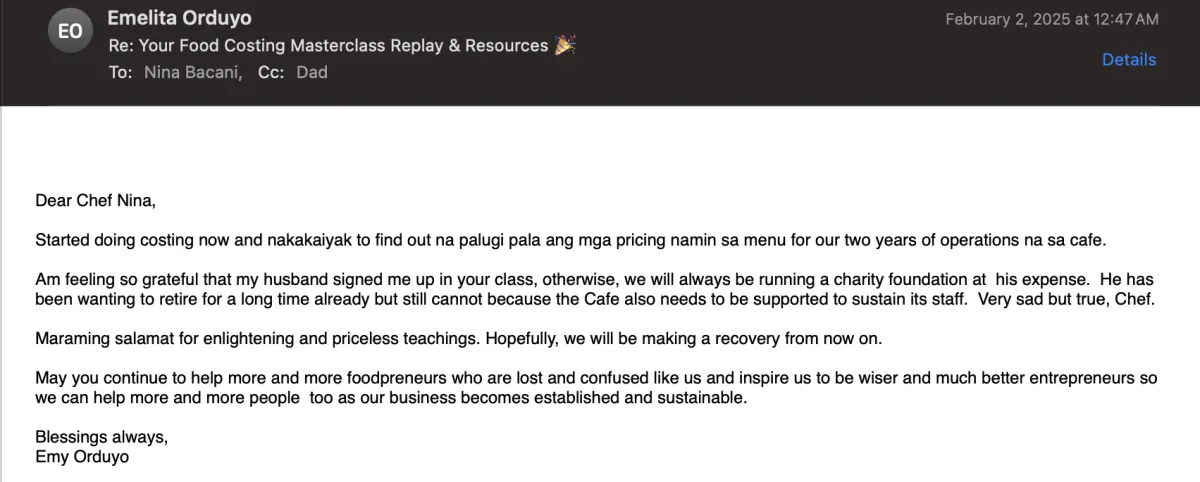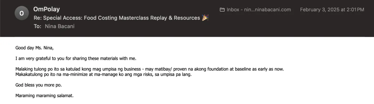 Through her ebook, Nina has helped thousands of Filipino foodpreneurs like you gain clarity and 💯 confidence in managing their food costs.
